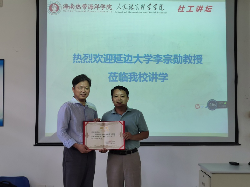 在讲座开始前,梁淑平老师对李宗勋教授的学术研究生涯进行了介绍,方礼刚副经理为李宗勋教授颁发“海南省南海文明研究基地研究员”的聘书。