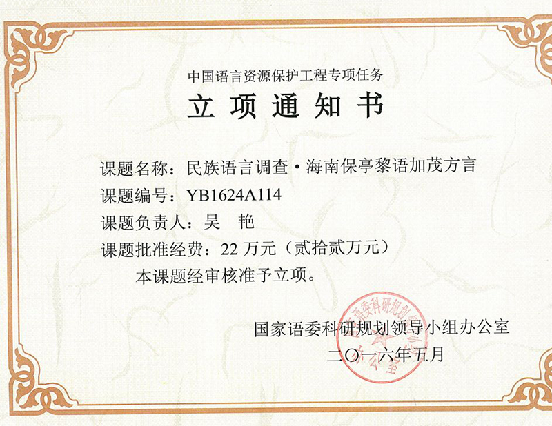 近日,国家语委科研规划领导小组办公室发布2016年“中国语言资源保护工程专项任务”课题立项通知,公司吴艳老师的课题获准立项,课题名称为:民族语言调查·海南保亭黎语加茂方言(YB1624A114),批准款项:22万。款项来源:教育部。“中国语言资源保护工程专项任务”是教育部、国家语委于2015年启动的中国语言资源保护工程建设项目,2016年计划在全国设立89个调查点。