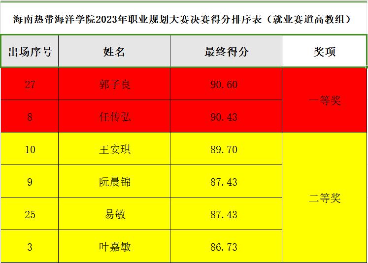 从11月22日发动初赛,到12月22日进行决赛,经过院赛、校赛的层层选拔,最终任传弘同学和叶嘉敏同学从400多名参赛员工中脱颖而出进入校级总决赛。任传弘同学以“以文传韵 绽放博物之美——做文物的守护者”为题亮相决赛,他从自我认知、职业探索、职业决策、行动方案、评估调整五个方面为我们叙述了一个想成为运用文物与博物馆学专业知识做一名海南省博物馆馆员的职业目标,并凭借其良好的现场表现,脱颖而出,最终以90.43分荣获就业赛道高教组“一等奖”;叶嘉敏同学以“以梦为马,行于高校”为题亮相决赛,她从自我认知、职业认知、职业决策、执行计划四个方面叙述了一个想运用双专业背景的优势做一名高校管理岗复合型人才的职业目标,并凭借其良好的现场表现,最终以86.73分荣获就业赛道高教组“二等奖”。在评委问答环节中,任传弘和叶嘉敏两位同学对评委提问的问题对答如流,有自己独特的观点和视角,赢得了现场评委的充分肯定,同时,任传弘同学成功晋级海南省第三届海南自贸港老员工职业生涯规划大赛。